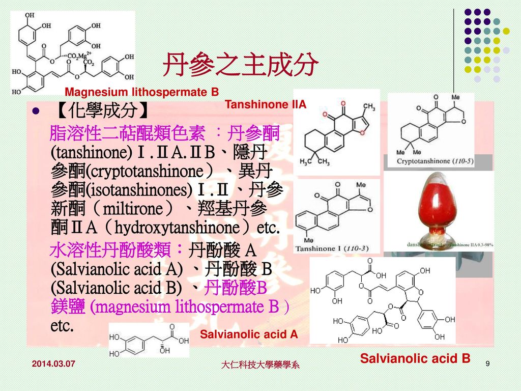 年來,醫學研究者認為丹參只有心腦血管疾病的有效成分已有五十幾種其化學結構以酚酸類化合物為主,包括丹參素、各種丹參酚酸、原兒茶醛、原兒茶酸等。其中